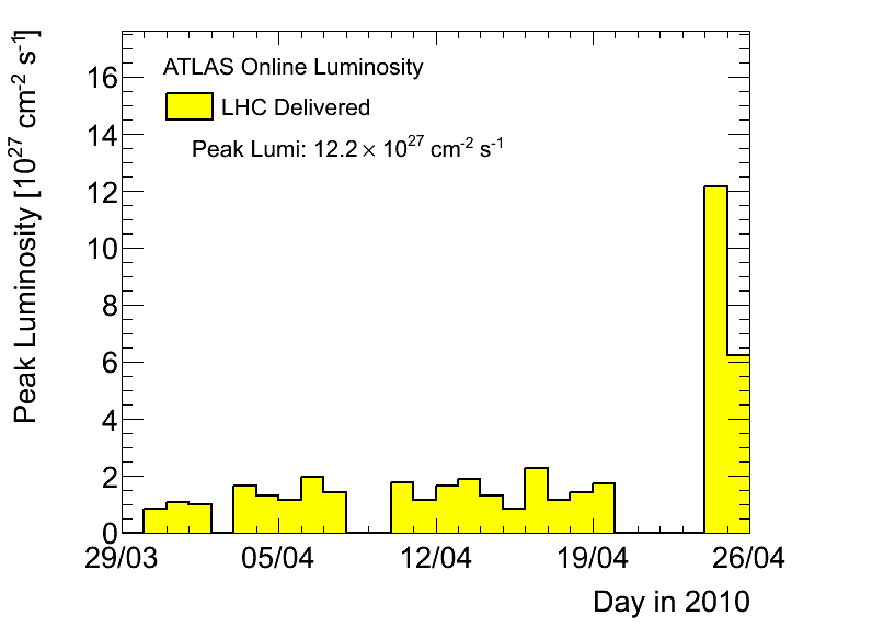 Above is a plot of how much luminosity the LHC delivered. The engineers are getting better and better at delivering data to the experiments, and it seems that every weekend, our total amount of data doubles. So, things are going well. However, we still are a long way off from having enough data to do really interesting physics. An analysis to discover the Higgs boson will require at least 10 inverse femptobarns of data, which is 100,000 times what we currently have. So, something like that is several years off. However, in a certain sense, the LHC and the experiment that I work on, ATLAS, is advancing rapidly through history. As we gather more data, we are able to "rediscover" particles that were first seen decades ago. We've already moved through the 60's and 70's, and in doing so we've discovered the charm quark and a particle known as the J/Psi (another odd name. It has two names because two different groups discovered it simultaneously and neither wanted to relinquish naming rights).