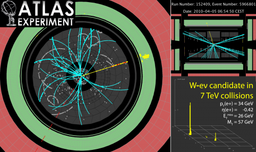 We're now progressing into the 80's. Instead of hair metal bands, though, we have W and Z bosons. About a week ago, ATLAS witnessed its first W boson "candidates." Of course, for anything that the detector sees, you can only say that it "looks like" a particular type of event. You can never know for sure because everything involving high energy physics is probabilistic. Let's look at the images to try to understand better.