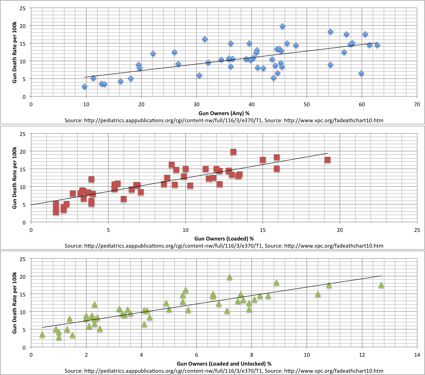 Thinking only from the perspective of data-presentation, these quickly-thrown-together plots are much more effective at making the desired point. When comparing gun-violence rates to the percentage of people in a state who own any gun, one can infer an approximately linear relation (with a decent amount of noise). However, when one requires that the guns be loaded or loaded AND unlocked, the trend becomes more discernible. In nearly the same area, one can include much more information, and more relevant information. The underlying argument depends on the existence of a trend, and only by displaying the entirety of the data in a simple yet proper way does that trend become clear.