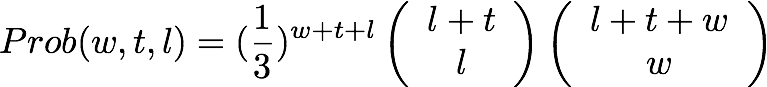 It’s easy to show that the probability of a particular end-game result of W wins, T ties, and L loses (ignoring order, which isn’t important) is given by: