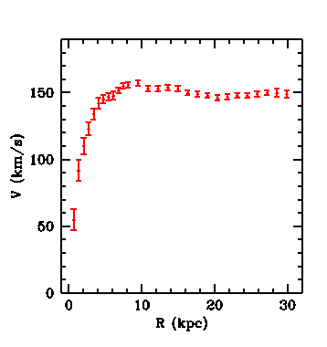 The above plot shows that the velocity of stars as a function of radius plateaus for high values of R, indicating that the speed doesn't depending on the radius from the center of galaxy as one would expect. This puzzling discovery led to the concept of Dark Matter. Scientists realized that these anomalous rotation curves could be explained if there was actually more mass in the galaxies being studied than we could see. If there were a large blob-like halo of invisible matter, then these curves could be understood without throwing out the known laws of physics. While it may seem somewhat of a stretch to invent a particle or class of particles to explain this measurement, it’s really in some way the simplest solution that the observations allow. These measurements of stellar velocities have been repeated and confirmed many times, so the experimental data is sound. The only other option to explain the anomalous stellar velocities would be to reject our well known laws of gravity, and doing so would certainly be more drastic than hypothesizing Dark Matter.