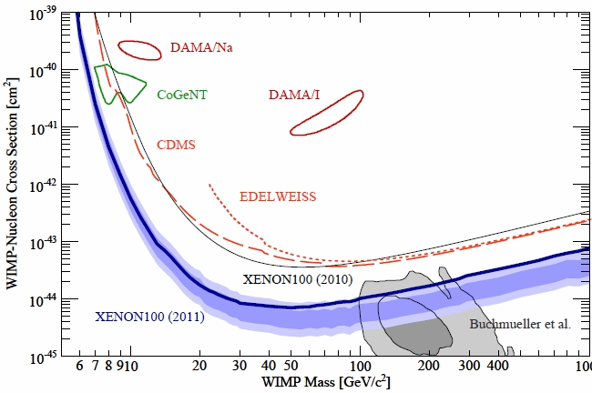 With these results, scientists are able to put limits on the properties of Dark Matter particles. The null experimental result constrains the type of Dark Matter that can exist (in other words, if it had certain properties, we would have already seen it in the data we've collected). In the above plot, the solid purple curve represents the limits placed by Xenon100's latest results. The x-axis is the mass of the dark matter particle, and the y-axis represents it's cross section (mean, how easily it interacts with matter). Any points ABOVE the the line have been excluded (at 95% confidence level) by the new Xenon data. Better limits mean excluding more dark matter scenarios (disproving something can be almost as interesting to a physicist as proving it), and curves in the above plot which lie down and to the left of the graph place stronger limits.
