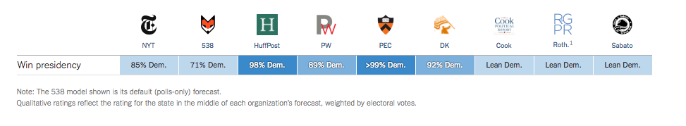 And as a result, Silver's predictions were the target of a large body of scrutiny and backlash, in particular because his model gave Trump the highest probability of winning among the most widely known predictions. At the time of the election, The New York Times' model, build by Nate Cohen, gave trump a 15% chance of winning, PredictWise a 10% chance, the Huffington Post only a 1% chance and the Princeton Election Consortium predicted that Trumps' chances were as low as 1%, stating that a Clinton victory was nearly certain.