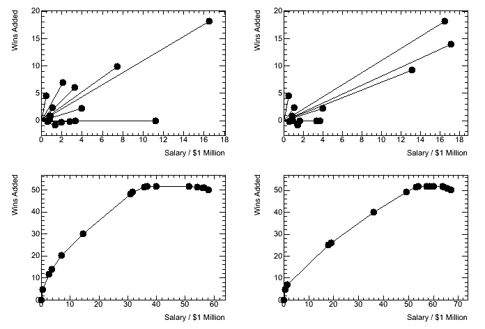 Yet, simply by looking at these plots, it becomes pretty clear that Silver’s model is vastly oversimplified. It treats the majority of players on a team as small line segments only incrementally advancing the team’s wins. The reason for this model’s failure is that it completely factorizes the players on the team: it treats a team as a blind sum of individuals instead of as a collect effort. But anyone who knows basketball, or any sport, knows that this is far from true. Players either enhance or hinder one another. A team consisting of only Carmelo Anthony and four middle-schoolers would not win 14 games against an NBA team because Anthony requires a supporting cast to succeed. And the effects of this cast isn’t easily quantifiable in terms of numbers, wins, or salaries.