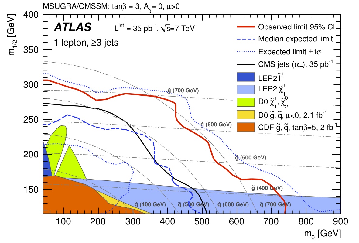 Because the theory of Supersymmetry introduces a wide spectrum of new particles, it is directly testable in experiments like ATLAS at the LHC. Of course, other accelerators have been searching for Supersymmetry (often shortened to SUSY) for some time, and no one has yet been able to discover any SUSY particles. When a physicist fails to make discovery, he can instead set limits. He can essentially say, “If SUSY of this form or that existed, we would have seen it in this experiment. Since we didn’t, we can now restrict the possible forms of SUSY that could potentially exist.” This is all we’ve been able to do thus far. Recently, using 2010 data, experiments at the LHC have managed to set the strongest limits yet on SUSY theories.