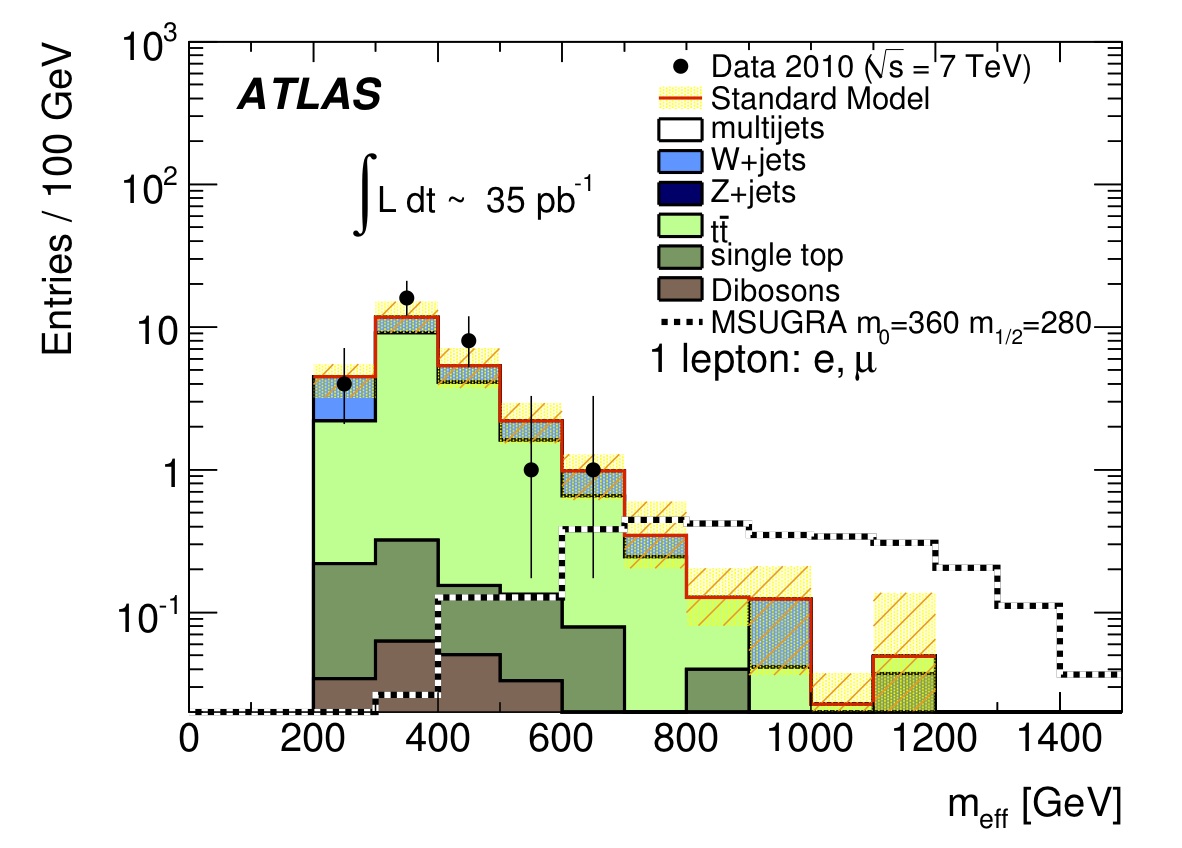 This plot shows several things at once. The x-axis is a quantity which this paper calls the “effective mass,” which here is a combination of the energy of jets, leptons, and missing energy of a collision event. It isn’t strictly necessary to understand the exact nature of this quantity to interpret this plot. The y-axis is the number of events measured or that one would expect to see in a particular bin (notice the logarithmic scale). Each of different colored stacks represents the expected distribution of a some background (most of these distributions come from simulation). For example, the dark and light green stacks come from top quark events, the dark brown comes from a class of processes labeled “Diboson,” and the small amount of blue comes from W-bosons. The dotted white and black lines are where SUSY would be if it were present. Finally, the solid black dots are the actual data: they’re what was actually measured by the detector. If SUSY existed, one may expect there to be black dots out by the SUSY curve toward the right. However, we see no such dots (it should be noted that, if you look at the y-axis, the expected number of events is less than 1 in that region, so it’s possible for SUSY to exist but not show up on this graph. This is a somewhat low-statistics analysis). Instead, you do see the black dots at the top of the stack of backgrounds, where we expect them to be, where they are predicted to be by the Standard Model.