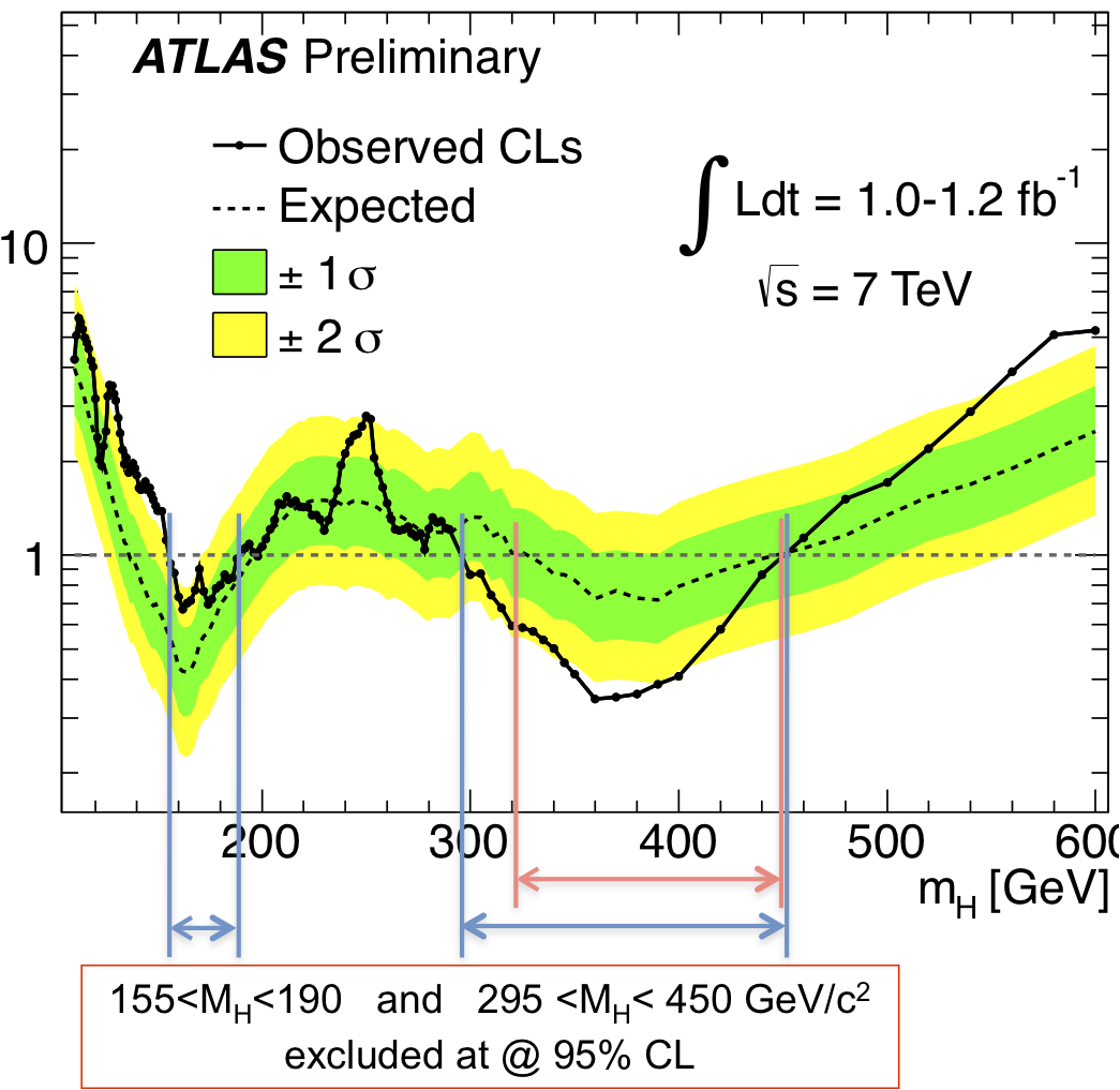If the measured limit in a particular region is significantly higher than the expected limit, it could indicate the presence of the Higgs. People have been very excited about these results for this very reason. If you look at both ATLAS and CMS’s results, the measured limits are found to be higher than the expected limits in the mass region between about 115 and 140 GeV. This region particularly interesting because it’s low enough not to be in conflict with results from precision electroweak analyses on the Higgs (which tend to favor a light higgs) but it’s not so low to have been excluded by the direct searches at LEP (the precursor to the LHC which collided electrons and positrons).
